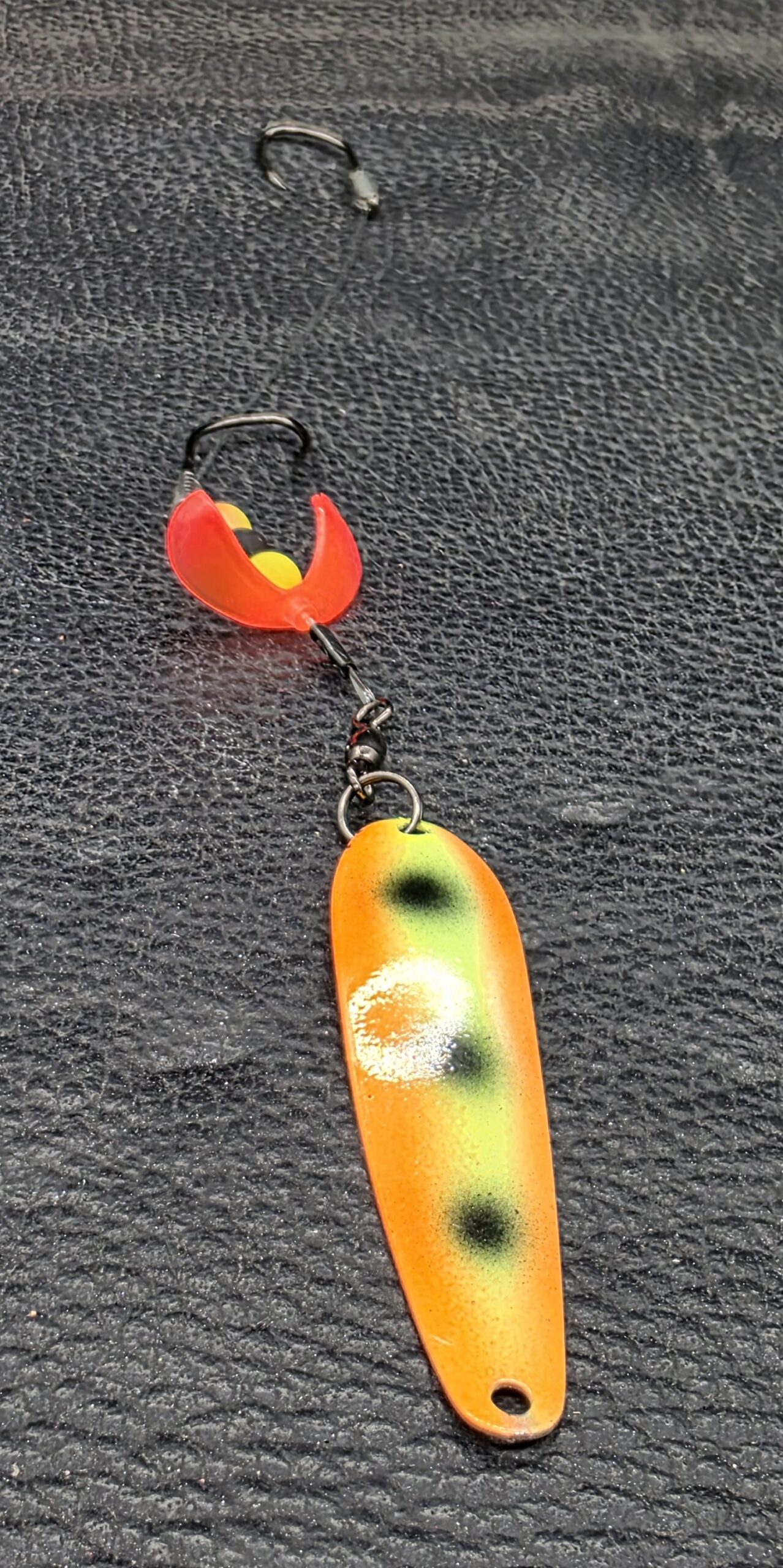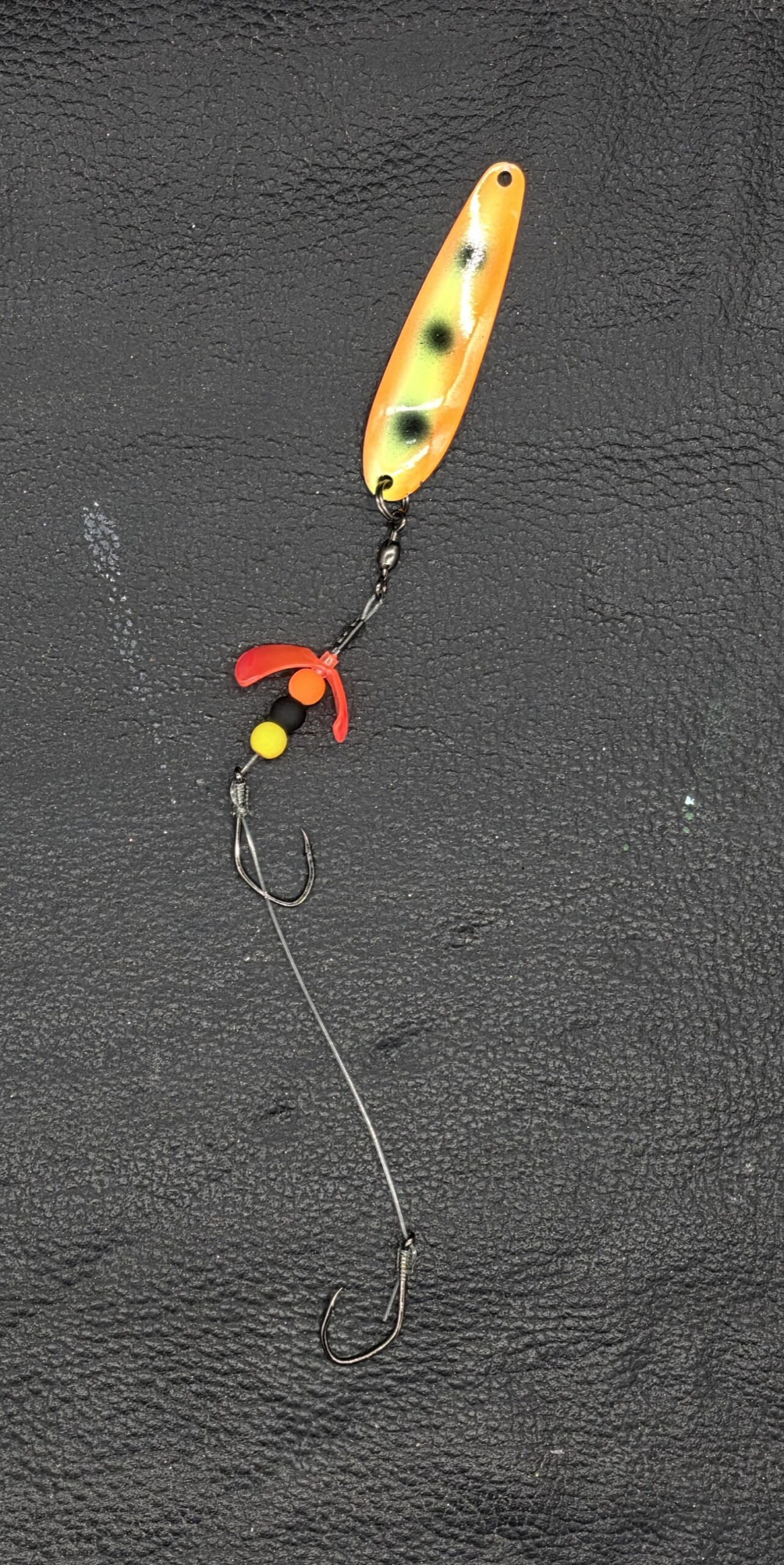 A custom bead stack adds contrast and rhythm, while dual size 2 sickle hooks—razor‑sharp and sticky—turn short strikes into buried steel. Every component is selected for durability, balance, and performance under pressure.