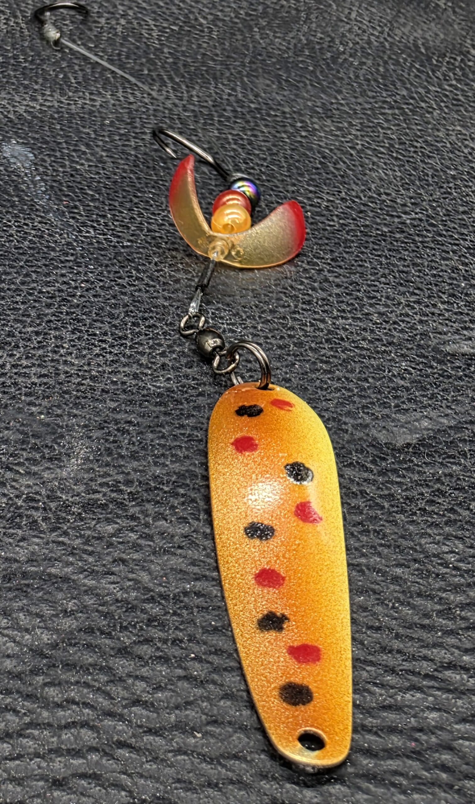 A custom bead stack adds contrast and rhythm, while dual size 2 sickle hooks—razor‑sharp and sticky—turn short strikes into buried steel. Every component is selected for durability, balance, and performance under pressure.
