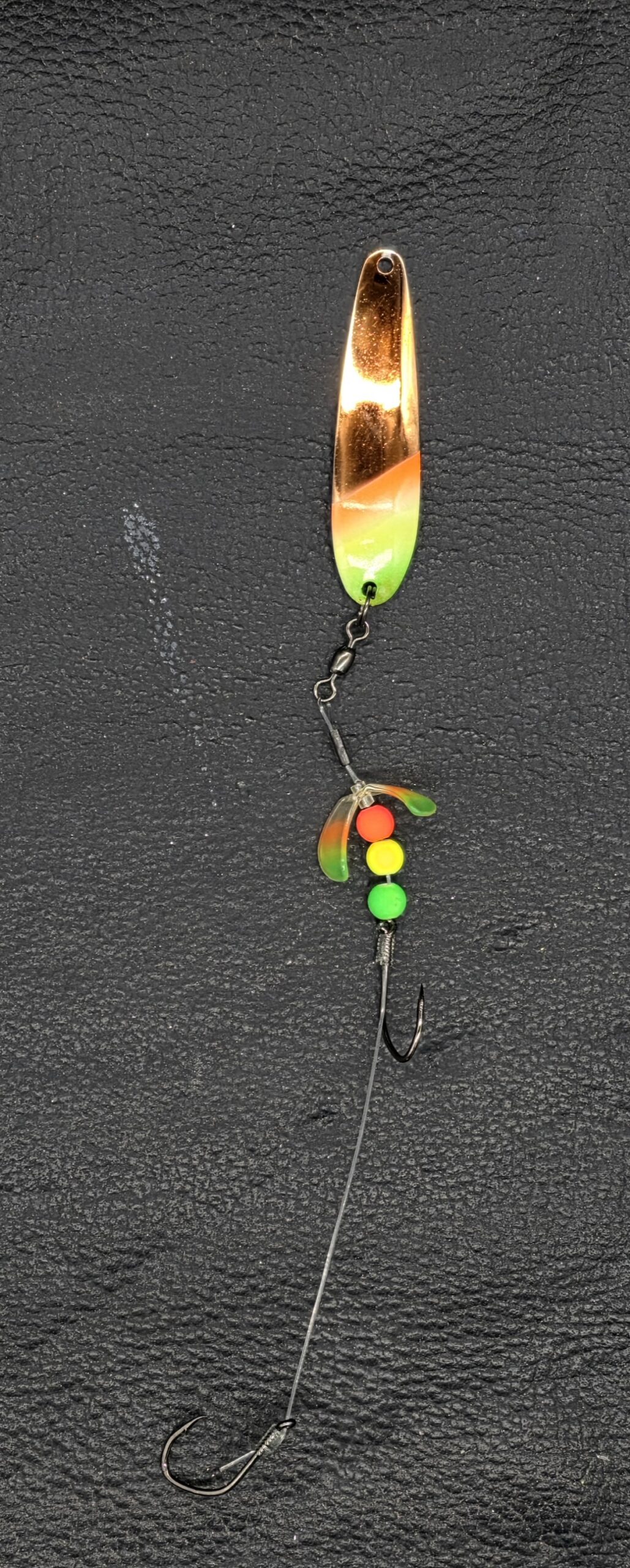 A custom bead stack adds contrast and rhythm, while dual size 2 sickle hooks—razor‑sharp and sticky—turn short strikes into buried steel. Every component is selected for durability, balance, and performance under pressure.
