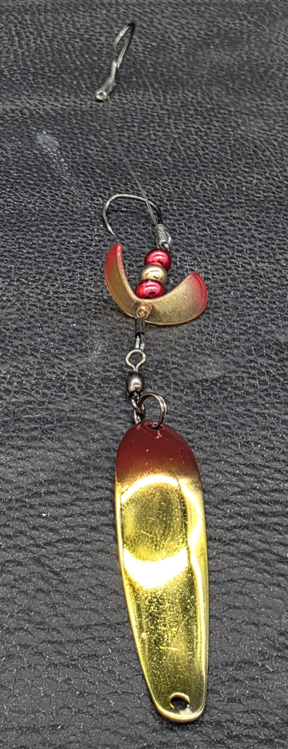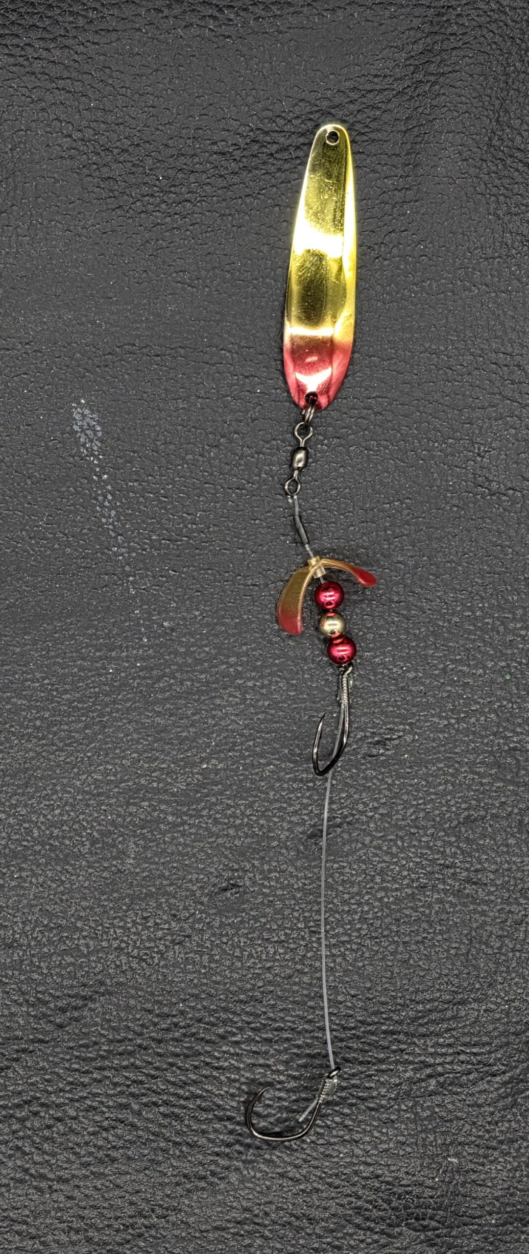 A custom bead stack adds contrast and rhythm, while dual size 2 sickle hooks—razor‑sharp and sticky—turn short strikes into buried steel. Every component is selected for durability, balance, and performance under pressure.